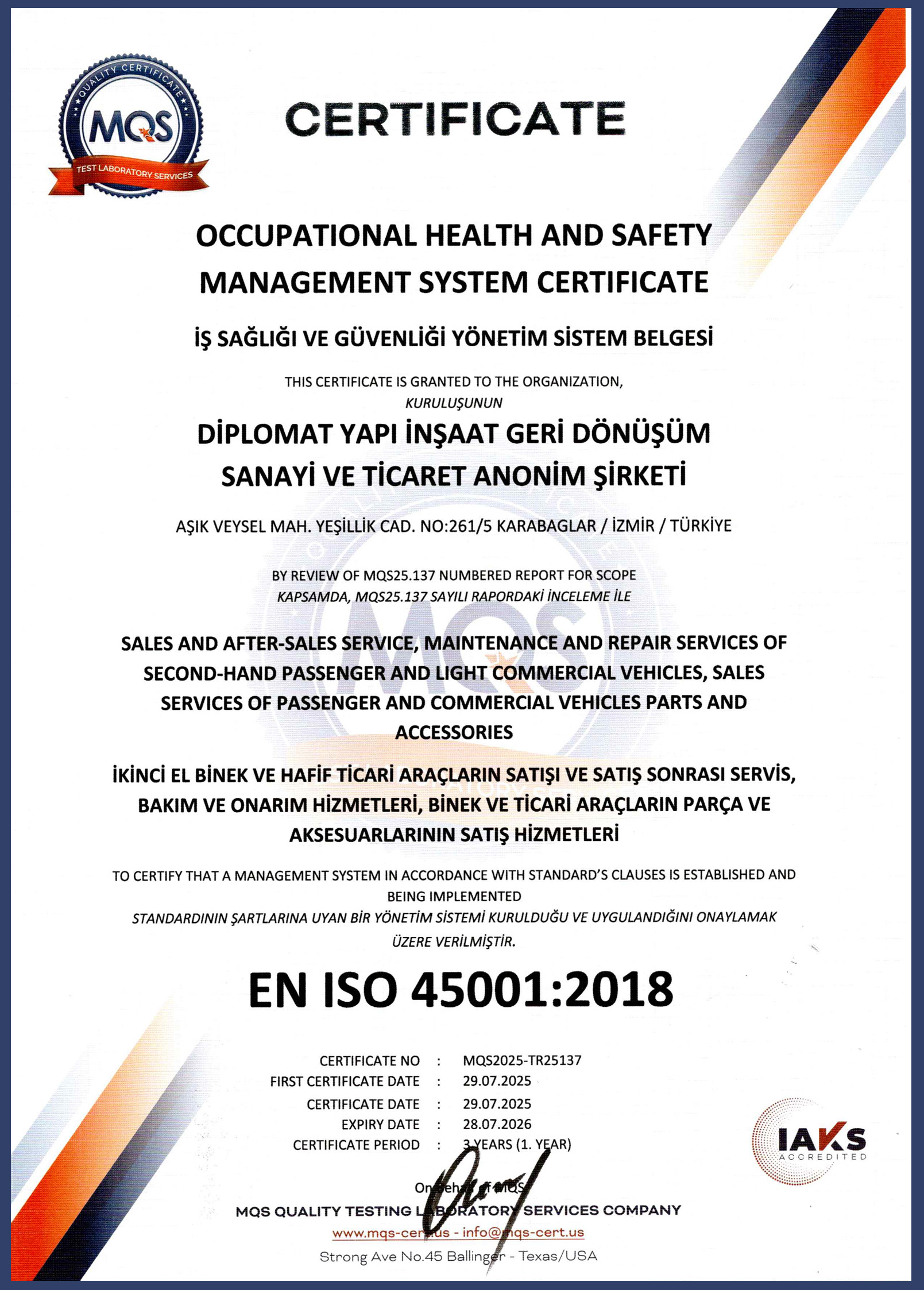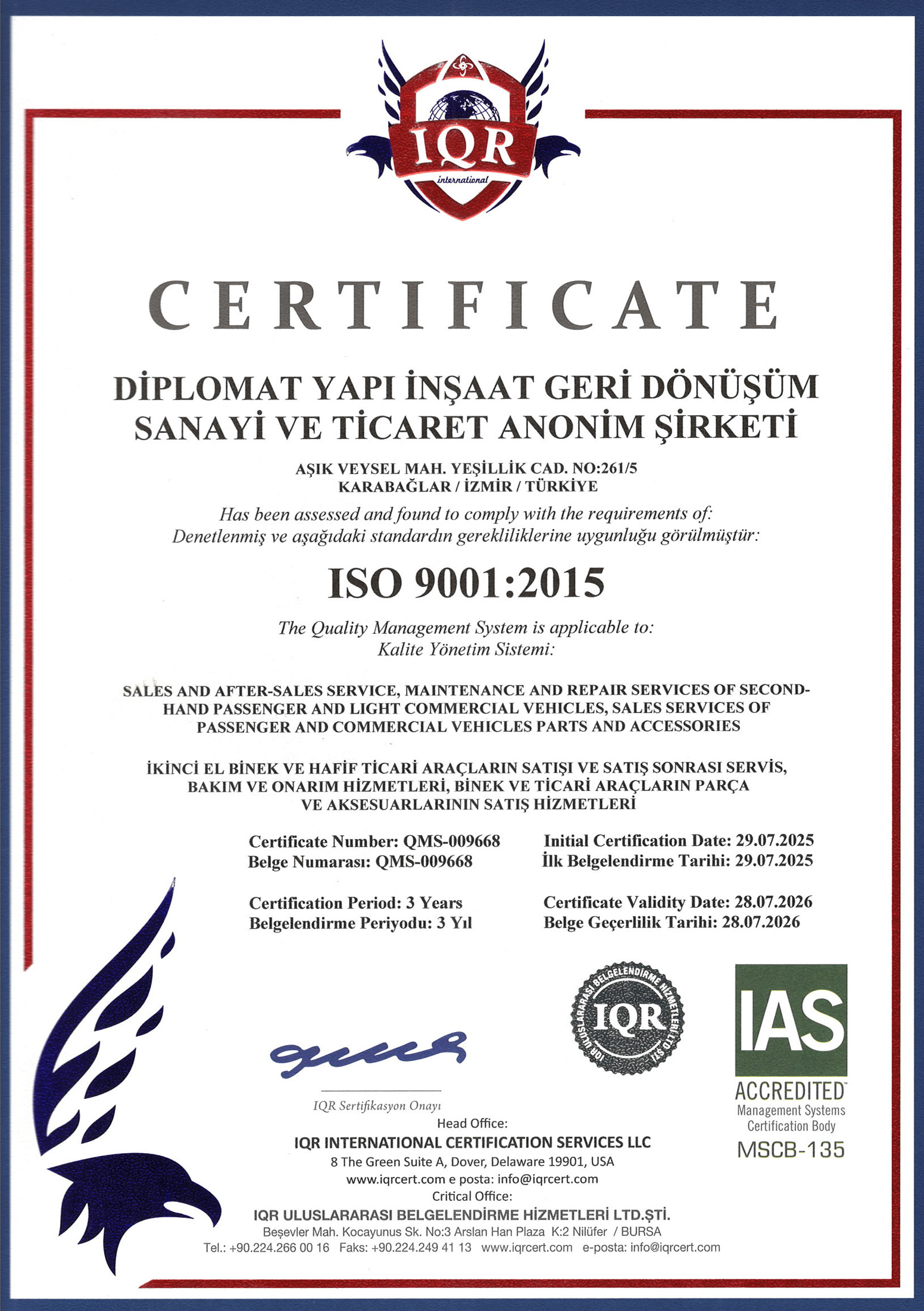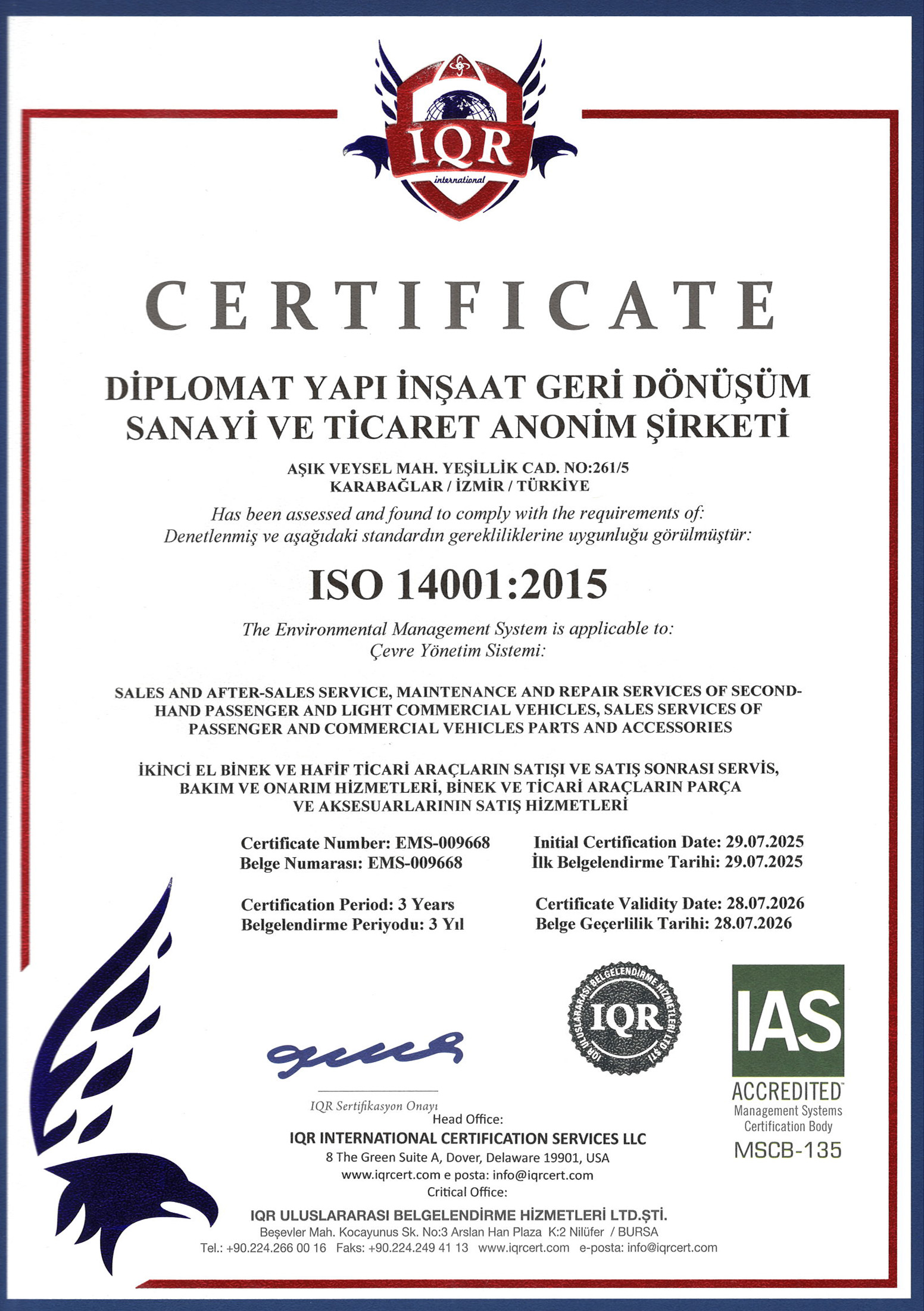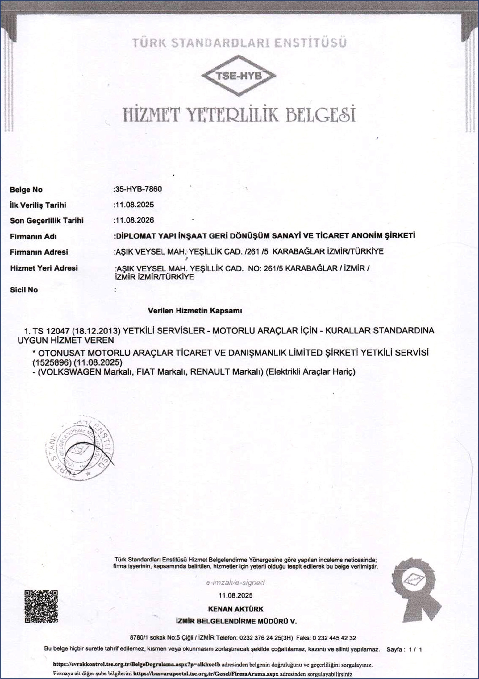 TSE-12047 belgeli, profesyonel ve güvenilir oto servis hizmetleriyle Diplomat Otomotiv, İzmir’de araç bakım ve onarım alanında öncü konumdadır. Kaporta, boya, mekanik bakım, oto elektrik, boyasız göçük onarım ve yedek parça hizmetlerinde, deneyimli ekibimizle güvenilir kaliteli çözümler sunuyoruz.